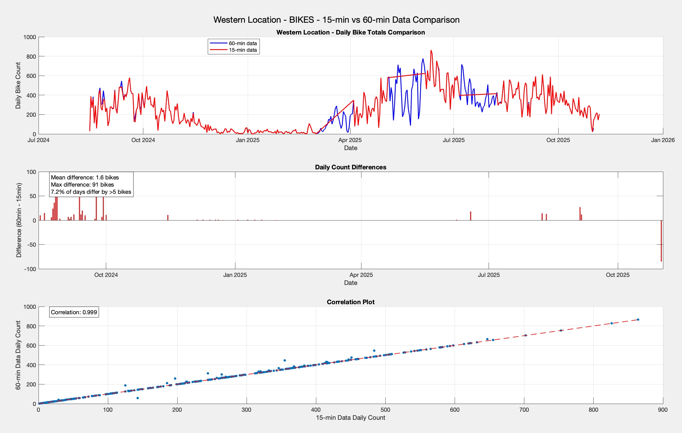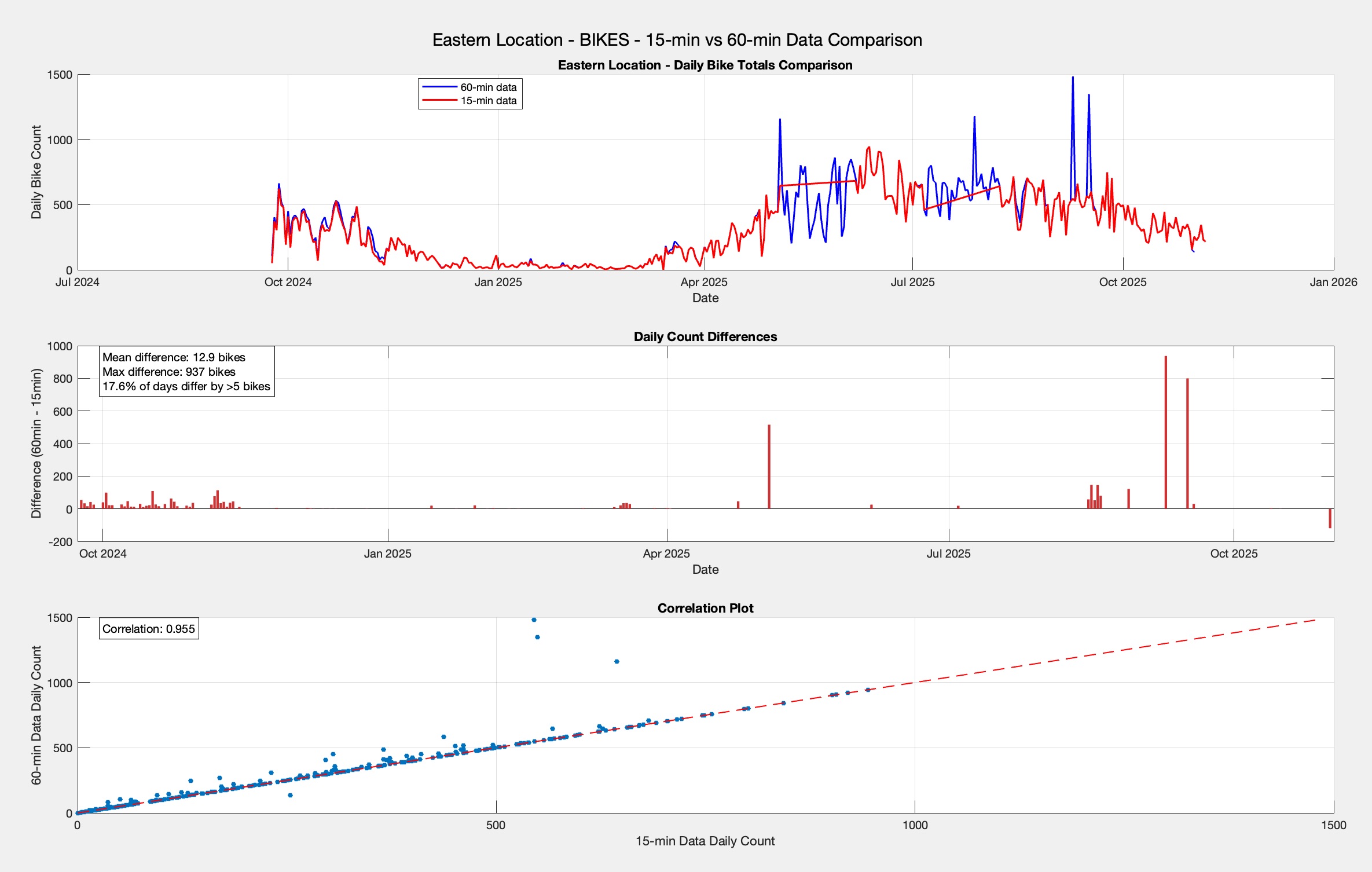 - When comparing daily totals from both resolutions, the correlation is 0.999 when data is present in both, indicating the 15-minute data is accurate but incomplete
