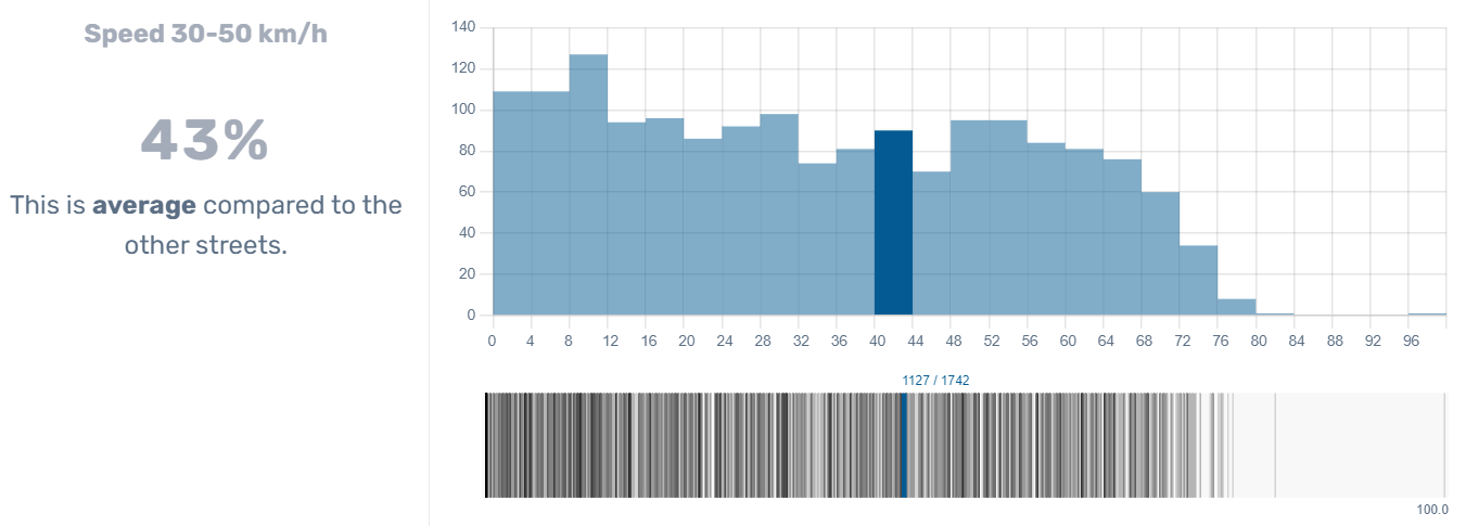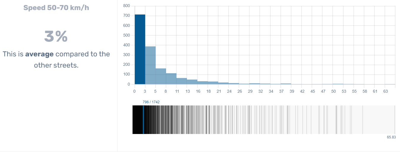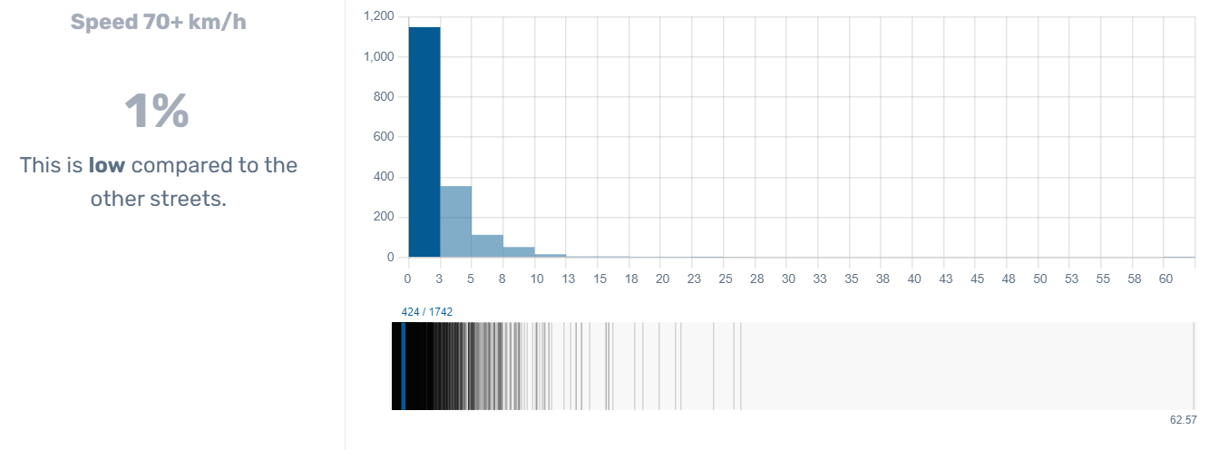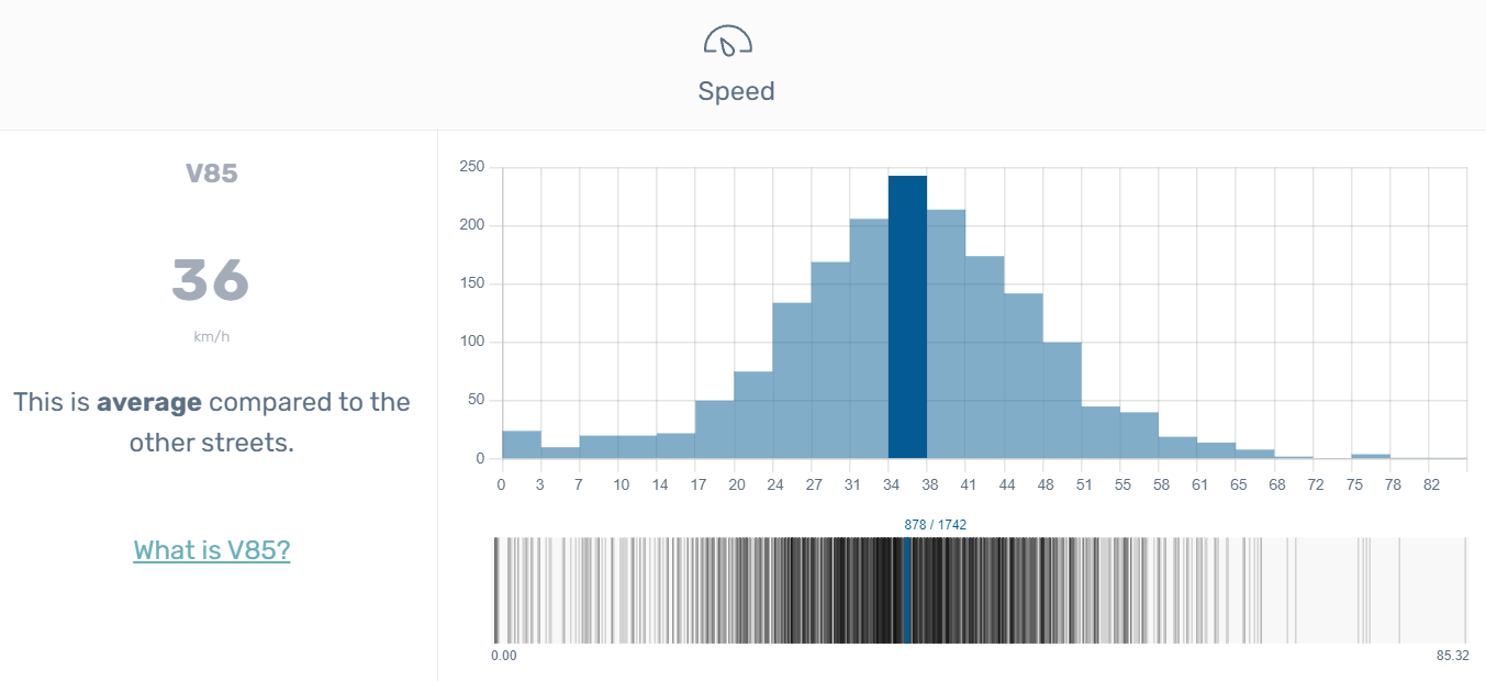 On the top histogram, you will find the average speeds recorded on the x-axis (horizontal) and the number of Telraams that recorded this average speed on the y-axis (vertical). To learn more about the V85, click here.