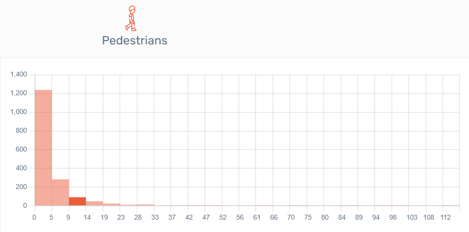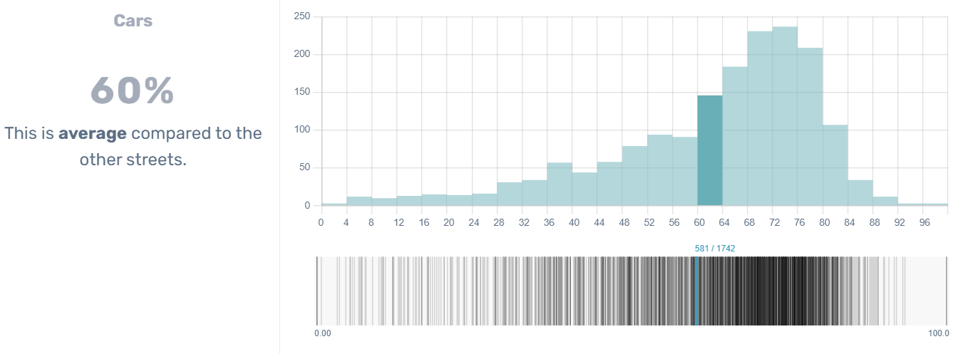 On this graph, the data for each of the streets included in the comparison are sorted by size. You can see the results for other specific streets by hovering your cursor over the graph. Data is provided for all vehicle types (pedestrians, cyclists, cars and large vehicles).
