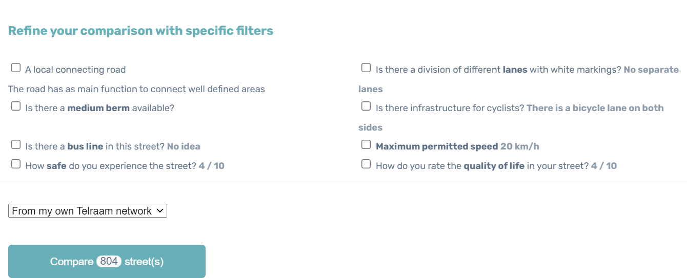 On the ranking page, you can select the streets with which you want to compare your street segment. You have six options:
