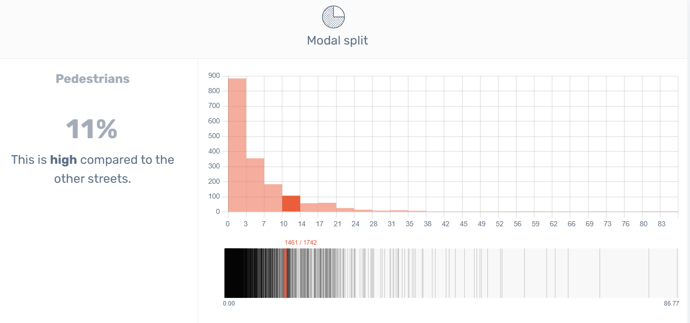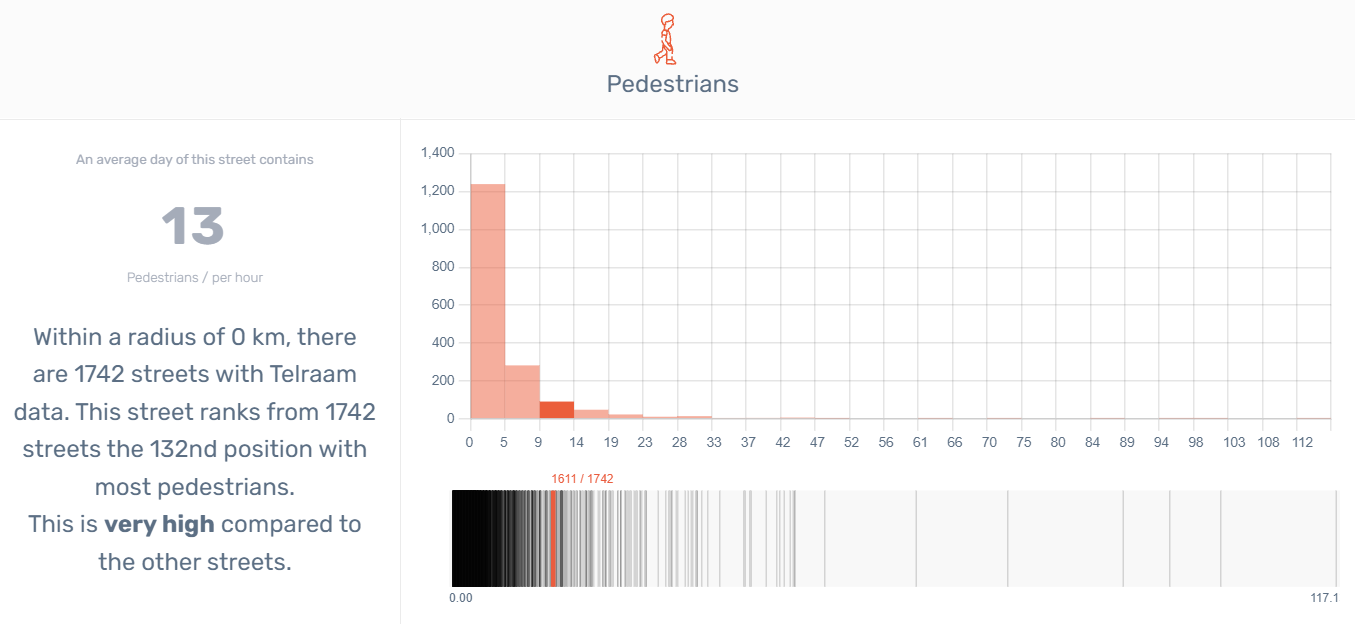On the left side of the screen you have an overview of the average number of pedestrians on your street and a summary of the comparison with other streets (very high, high, medium, low, or very low).