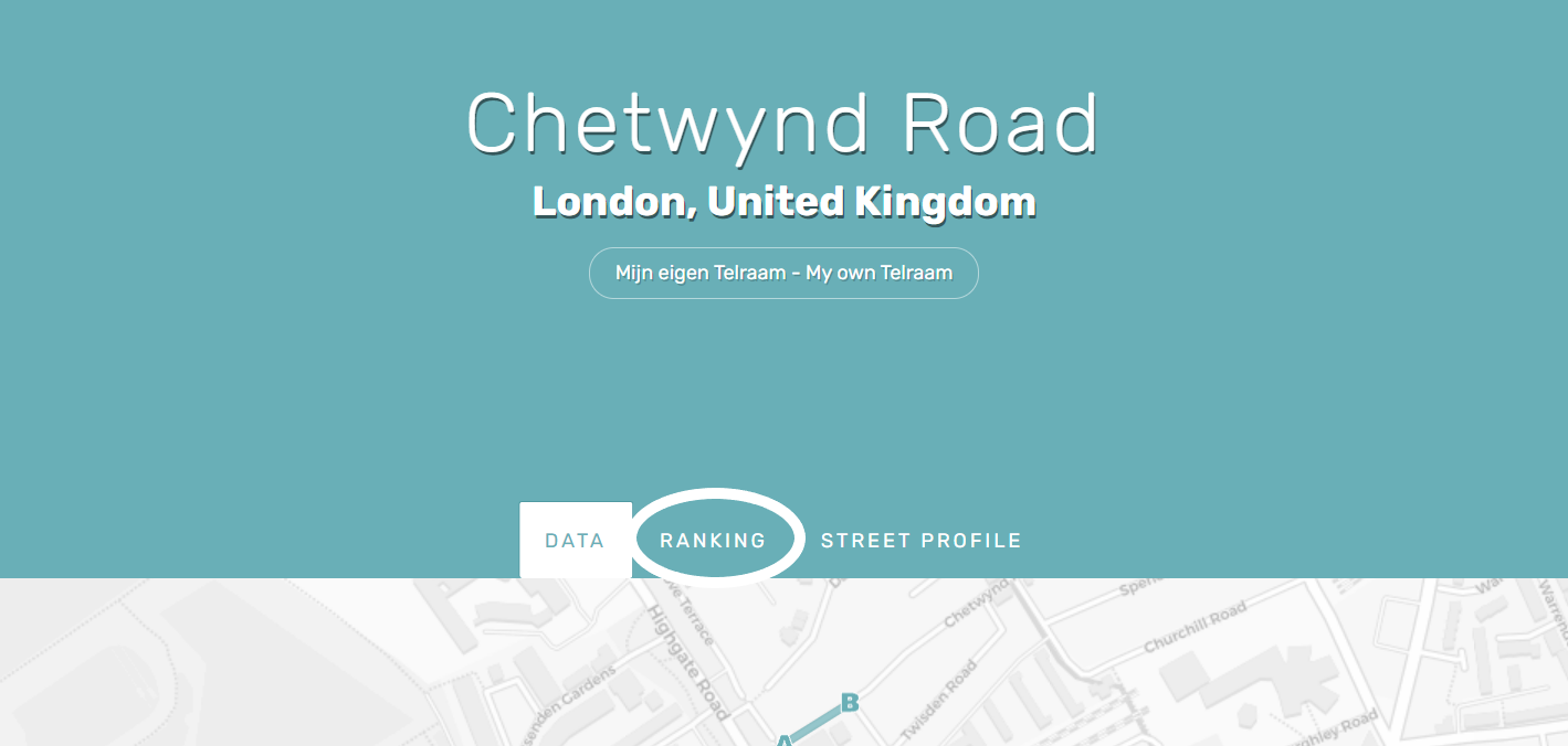 Ranking allows you to compare the situation of your street or street segment with other streets. You can compare each street with other streets in your own neighbourhood or, via your own private dashboard, based on your own street profile.